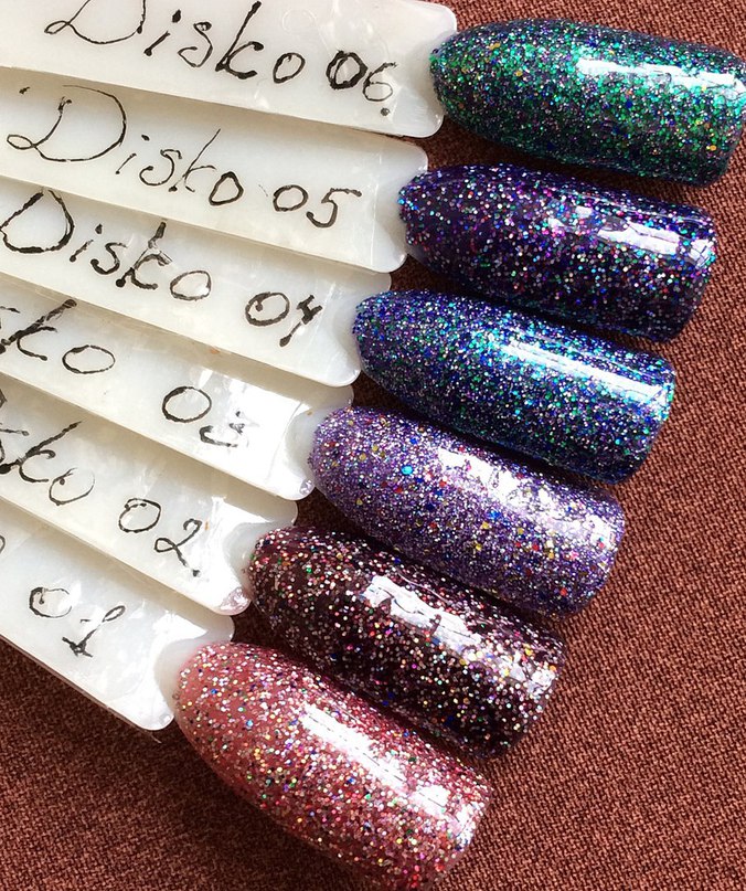 - Colored gel polishes. The manufacturer divided these products into two lines. Basic: here are collected enamel and pearl varnishes of various shades. Disco: This line is presented with gel polish with glitter. A great option for parties and going to a nightclub.