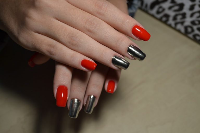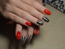 For a party on a special occasion, you can use a design with metallic sheen. Create a perfect mirror coating will help the shimmer with the smallest particles in the rubbing technique. To create a unique shine, you can use red glitter for nails.