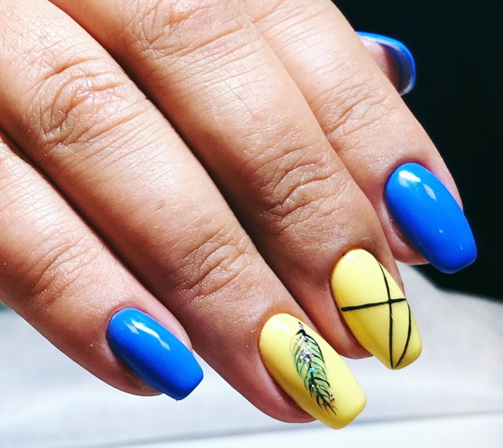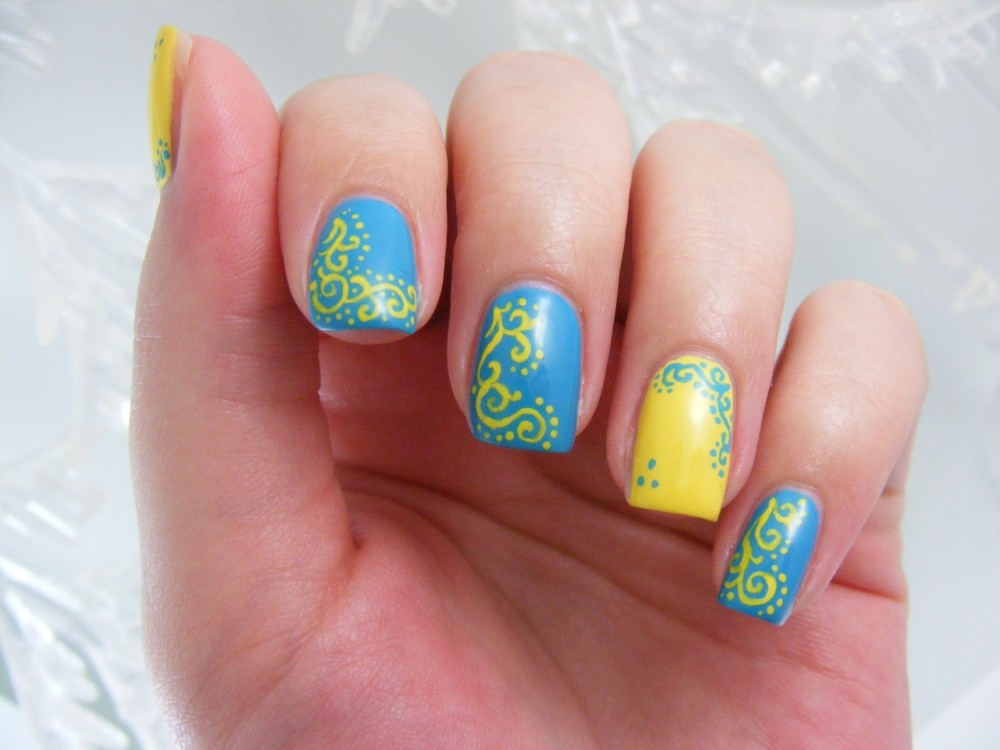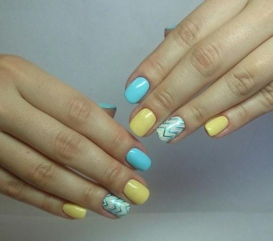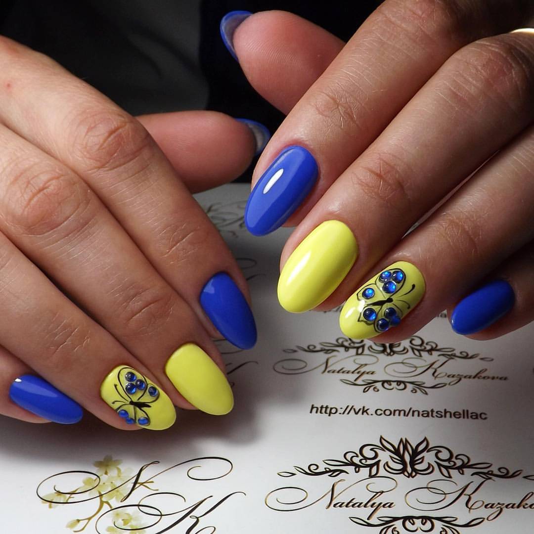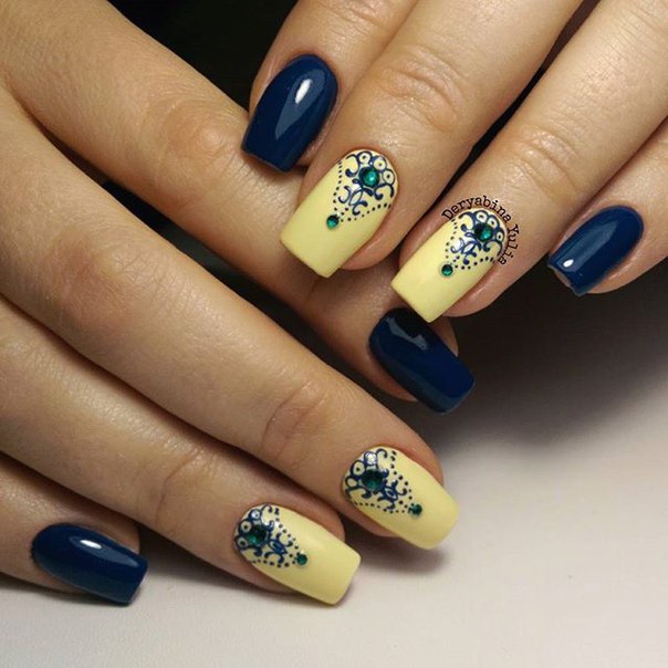 - Yellow-blue. To make yourself such a design, one part of the nail plates must be covered with a yellow gel polish, and the other - blue. In this case, it will look good and soft blue. After that, on some nails you can make small images in the form of flowers, hearts or a simple floral ornament. You can apply a picture using special brushes. In this case, white, beige, light blue or black lacquer color is perfect for a picture. Also at the end several small shiny rhinestones can be attached to the nail plates.