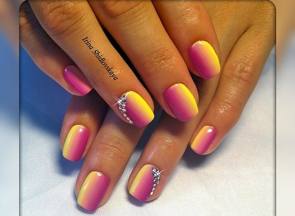 - The original design option is considered ombre This manicure is performed in several shades, seamlessly converging into each other. In this case, yellow gel polish is usually combined with orange, pink, red, blue tones. Moreover, the gradient can be done both in the vertical direction and in the horizontal direction. Ombre can be left without decorating, since this design already looks interesting and harmonious, and can be slightly diluted with additional elements.