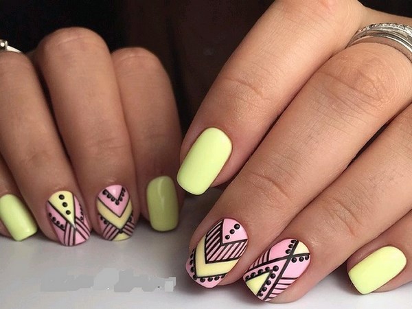 - Yellow-pink with black pattern. First, the plates are painted in yellow and pink gel polish. And with this design the matte covers will look the most impressive. After that, you can apply the picture. Most often, in this case, thin geometric figures are depicted on the surface of the nails. It is permissible to make similar pictures on all records.