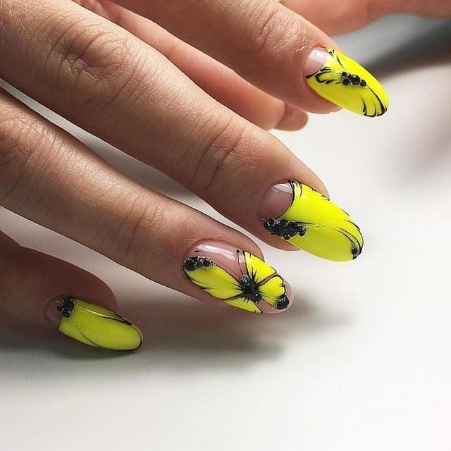 - Yellow manicure with black pattern. All nails are covered with gel polish yellow. You can take a glossy finish and frosted. Then proceed to the application of images on the plate. If you used a matte gel polish, then for pictures it is recommended to take a glossy black coating. With this design, the nails will look more noticeable and bright. Fine peas can be applied to the surface of the plates. The pattern in the form of a vegetative ornament with a small scattering of sparkling sparkles will also look harmonious.