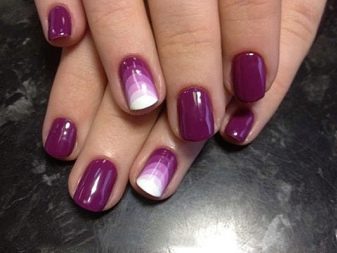 To draw the next strip (it should be placed side by side), you should mix the main color with white on the foil. Butt is drawn strip the same width of the resulting shade. Everything is dried in the lamp. This is done several times. The last strip should be white. After creating the decor, the top layer is applied, and the nails are dried in the lamp. This gradient looks quite new and unusual. It will attract the attention of others and the opposite sex.