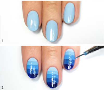 In the global network there are many of the most interesting options for the implementation of the gradient. We will tell about some of them. For example, ombre in the form of diagonal stripes. You will need to stock up on tape and pick up a few shades of blue gel polish. The nails are initially processed and covered with a base that is dried in the lamp.