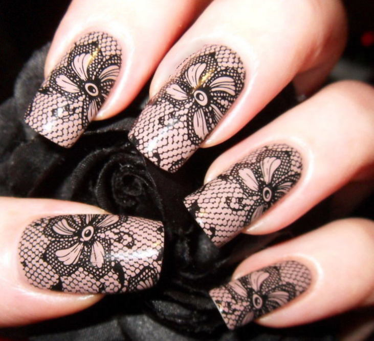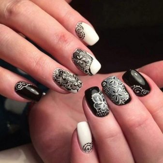- Stencils greatly facilitate the work when creating a manicure. As a template, not only special purchased ones will be suitable, but also made and available tools. For example, for geometric patterns, you can use a narrow masking tape, and for an openwork pattern, a piece of lace or tulle.