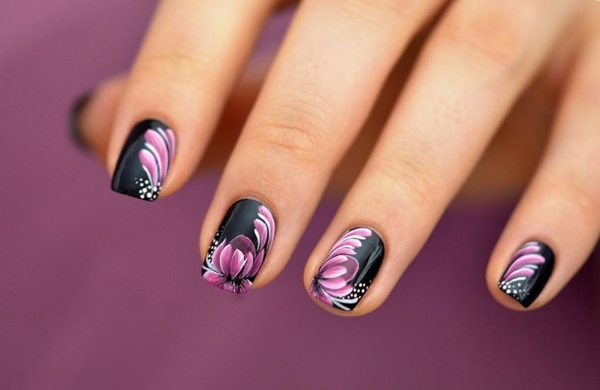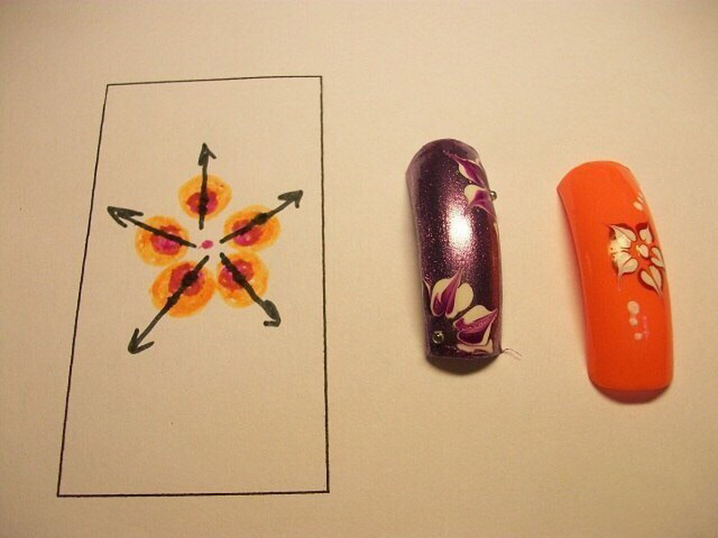 The easiest way is using dots. In this case, first gel polish is collected on the ball and the middle of the flower is placed at the desired location of the nail. After the larger diameter dots, round petals are marked around it.
