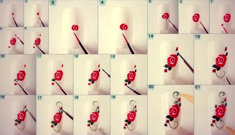 Reproduce quality rose is not obtained by all masters. But the simplest sketch can be done even with your own hands. To do this, you need a dot brush or a short liner. We start to draw a rose from the center. Dip the very tip of the brush into the lacquer and, holding it vertically, put a dot, and from it draw a comma. The next arcuate line is twisted in the other direction. And so in a circle several times, increasing the length of the arcs. That's all.