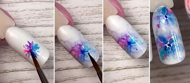 Flowers sometimes paint not on a dried basis, but on a “wet” layer. In this case, the background is not dried, it immediately begins to work in another shade. Drops are applied at the locations of the petals and gradually stretched with a needle, toothpick or fine brush. It turns out a kind of watercolor effect, as the gel varnish spreads.