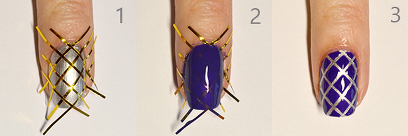 To get even strips, it is enough to use ordinary masking tape, making them stencils for drawing. More complex templates are offered by manufacturers of manicure materials.