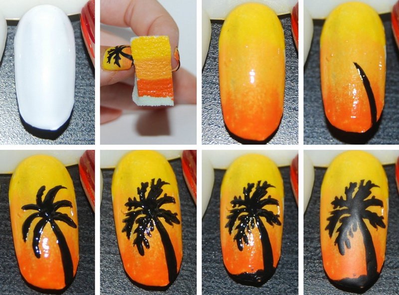 There is nothing complicated about drawing a palm tree. Any thin brush will be required. The drawing begins with drawing the trunk from the hole of the nail plate.The line should turn out with a thickening from below, thinner from above and with an inclination. Then a drop of varnish is applied to the top and palm leaves are pulled out of it in different directions. Usually from 4 to 5 pieces. The jagged edge is better to draw with a needle or if you have skills with a brush tip.