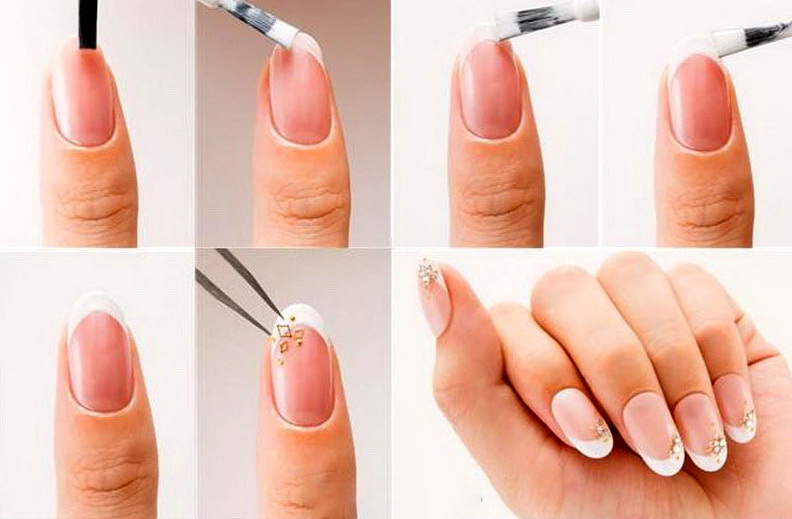 The holes can be painted with a dagger-shaped brush, and the edges of the French manicure are either the same or the usual flat one. To do this, the tool is applied first on one side and the line is led to the center, and then on the other side, also to the center.