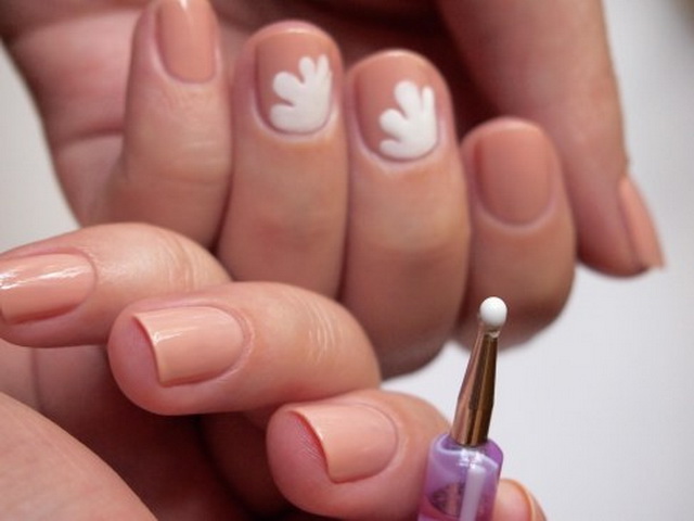 - A dotted or beveled brush with white lacquer paint the petals, starting from the outside to the middle. On those nails, where two flowers, one of them is better to make a little smaller.