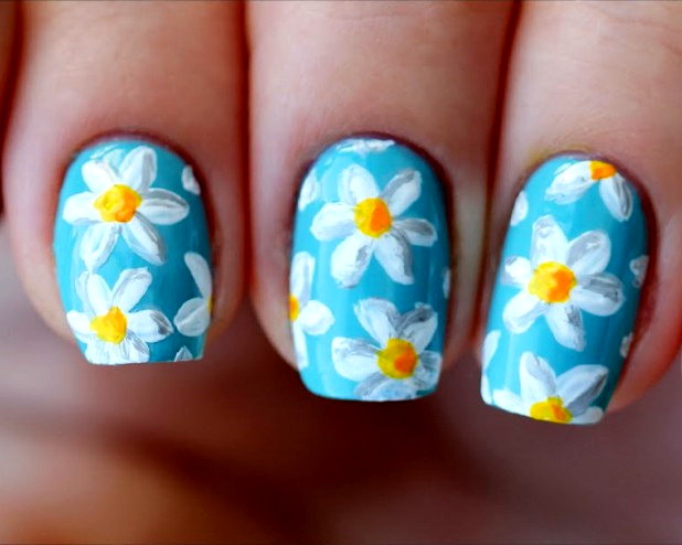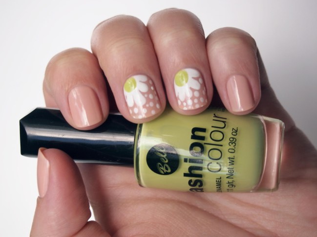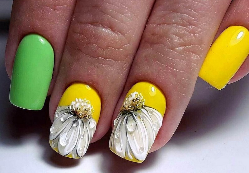 - Then proceed to the creation of chamomile pattern. With the help of a dots or ordinary toothpicks, yellow drops are applied at the locations of the daisies: on the little finger and index finger one by one, on the middle and ring finger - two each. Usually the pattern is arranged symmetrically. Therefore, on two fingers on the hand, chamomiles will be to the left of the center, on the other two - to the right.