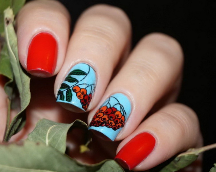 Another category of popular patterns are summer models. These include palm trees, fruits, berries. In the summer you can often find a manicure with a sketch of a watermelon or strawberry, ladybug or sunflower. Some prints are simple to create, others should be crafted to create.