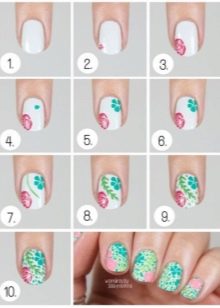 After that, wipe the instrument with a napkin and repeat the procedure, but with a different shade of gel polish. And so on until the end of the nail plate. Points may be different in volume. After the design is completed, everything is dried in the lamp and fixed with a top coating.