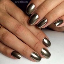 This option looks stylish, bold and interesting. The shading tint is obtained from the gel polish on which the substance is applied. It can be silver, white, copper. These nails have a mirror shine, attract the attention of others.
