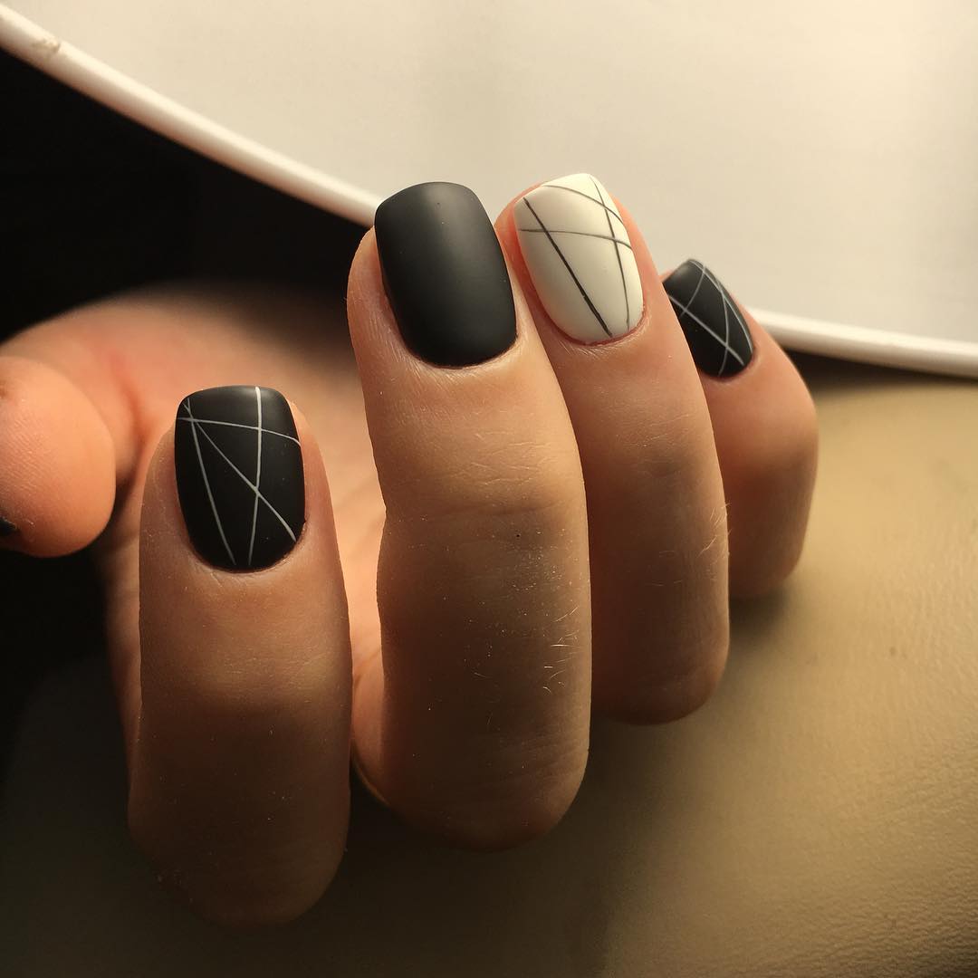 - Geometry. If you like geometric patterns, then your manicure will also be fashionable. Remember that for a short nail plate, you should not use horizontal lines, but rather prefer vertical stripes that will visually make the nail plate longer. You can make a similar decoration on one or several fingers to place all the accents.