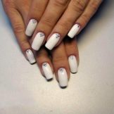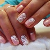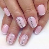 In addition, at home, you can create at least an interesting manicure for short nails, which will combine pastel pink and white shellac. To dilute the monotony of the design, marigolds need to be decorated with rhinestones and patterns with decal stickers. Consistently it looks like this.