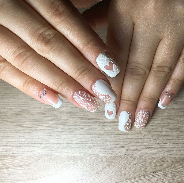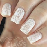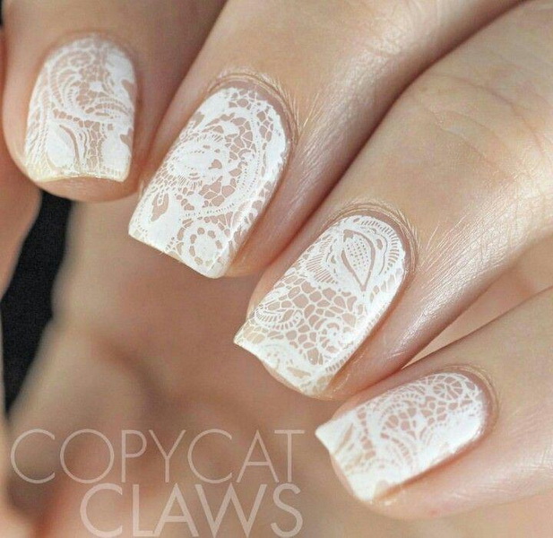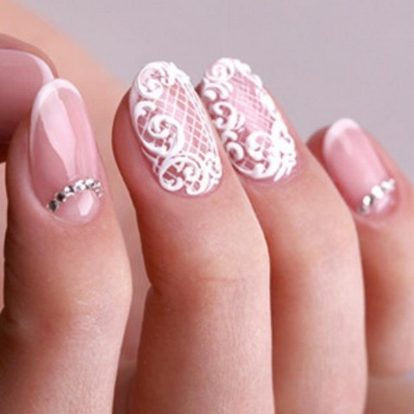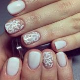 It is a light and sophisticated nail art that looks interesting against the background of a white lace dress. To make such a design, the plates are covered with shellac in nude shades and draw patterns in the form of lace. They will indicate the romance and naturalness in the image of a girl. The only thing that such a design looks good only on long marigolds.