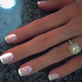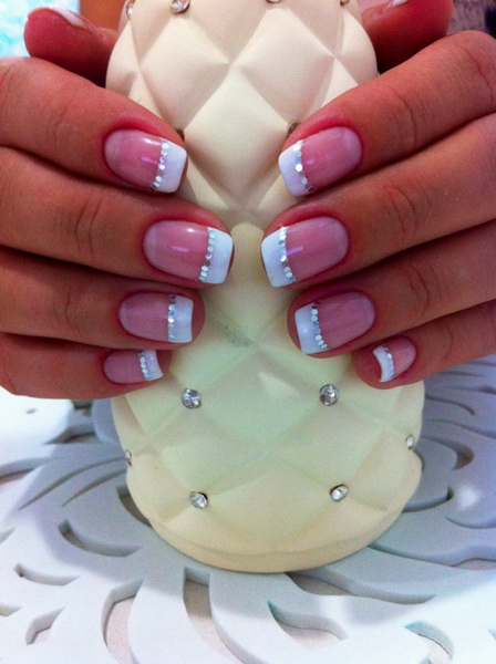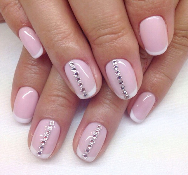A gentle combination of pink base with a white stripe will not leave anyone indifferent. Such a design favorably emphasizes the elegance of a young beauty and perfectly complements the image with a ring and a white dress. If desired, the French manicure can be supplemented with a bright accent, it is best to place it on the ring finger. For this, shellac coating is decorated with patterns laid out of stones and rhinestones.