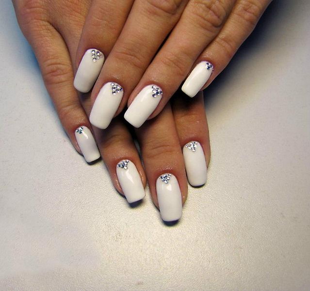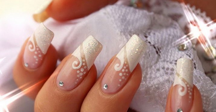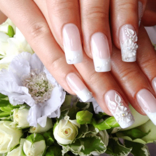 For brides who have wide nail plates, masters are advised to use acrylic molding in manicure, it is applied on shellac coating. Thanks to the correctly chosen colors and shaped elements, the nail will visually stretch out and the handles will look amazing. Most often, wedding styling used modeling in floral motifs.