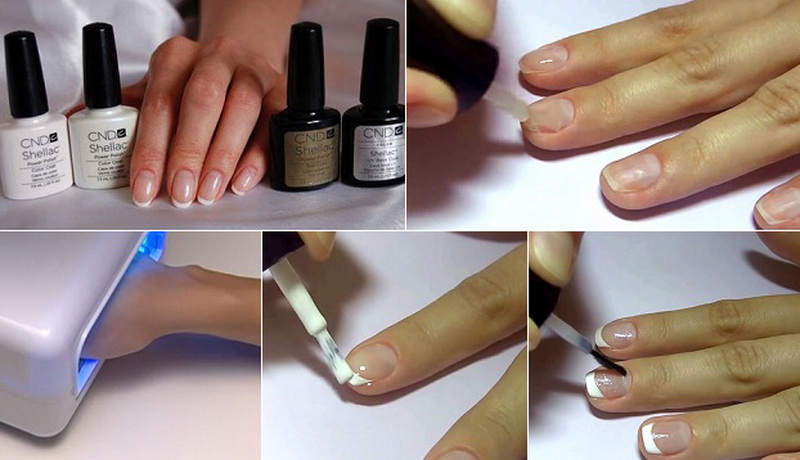 - When the nails are prepared and cleaned, they are covered with a base, then with colored shellac, and dried in a UV lamp.