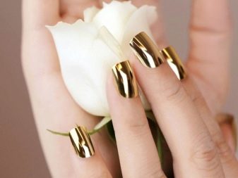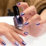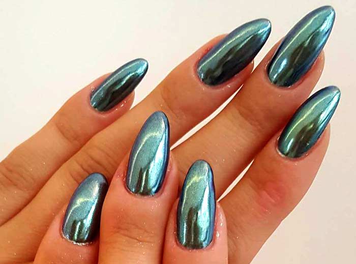 To obtain a mirror shine well fit and rub. It is a fine powder with metal particles, which, when applied, penetrate the varnish and give it an amazing soft shimmer. This method is also good because the choice of the basic color of the manicure is simplified.