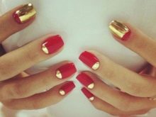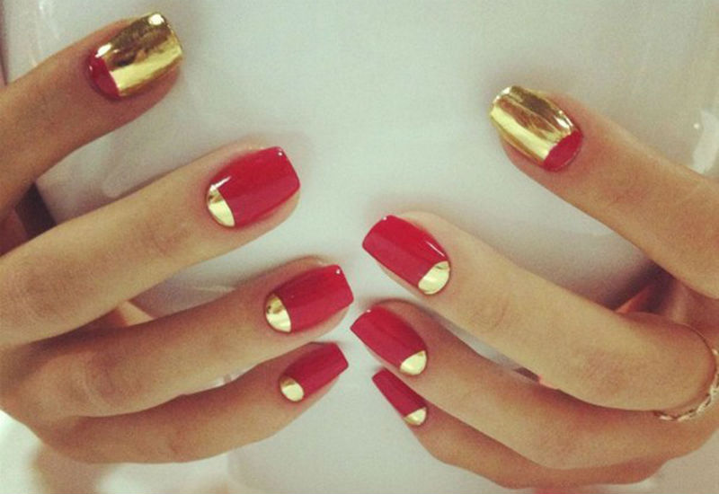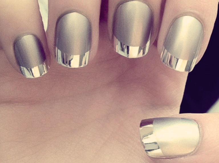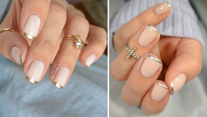 This type of coverage creates unique combinations with other types of manicure. So, it is actively used as a bright detail of the lunar design. A small mirror semicircle at the base of the nail or on its tip immediately attracts attention. But when decorating it is necessary to remember that metallic is better suited to the cold colors, and gold is better to complement warm colors.