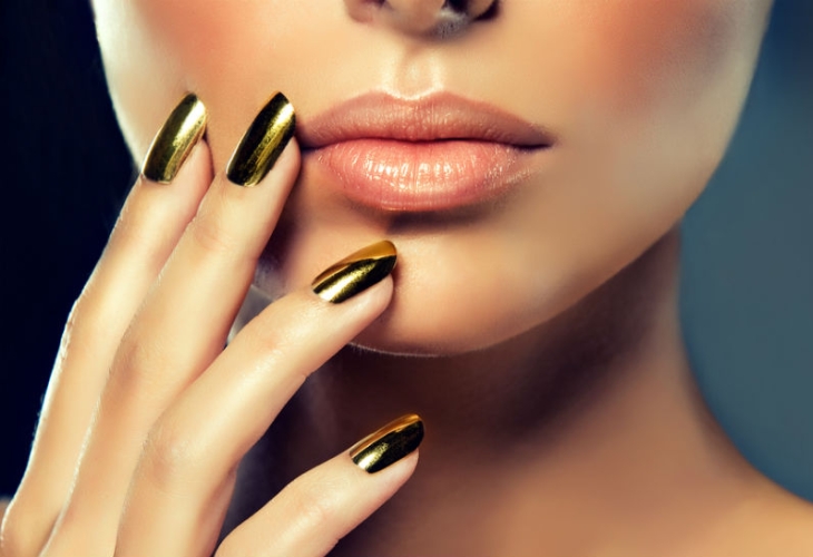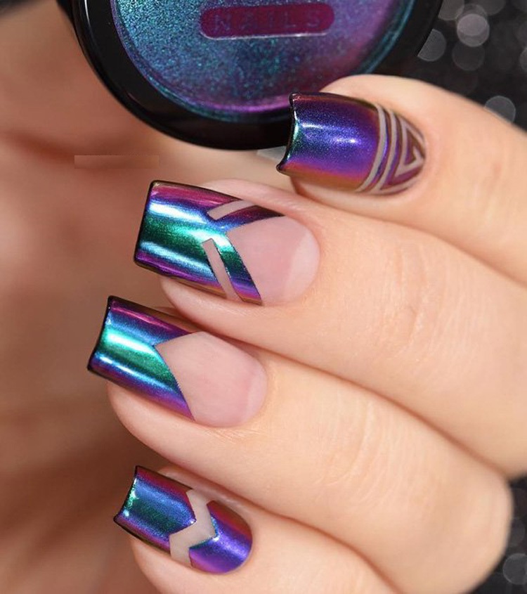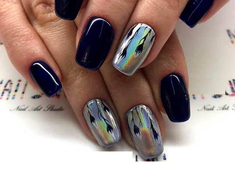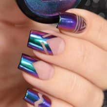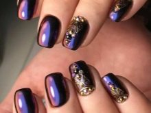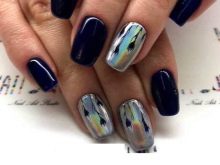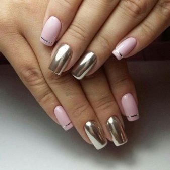 The most fashionable trends of this style are mirror-design nail designs with a metallic effect. The most advantageous on the nails look silver and gold coating. These colors are universal, as they can not only make up an independent composition, but also perfectly complement each other, as well as other shades.