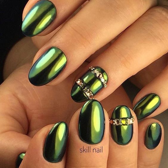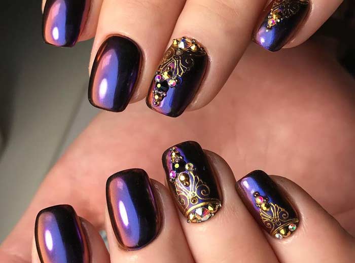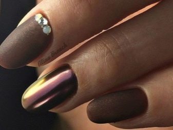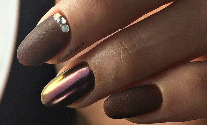 But the design decisions of specialists in nail art include not only the most reflective surfaces. Creating a moderate shine with a small amount of rubbing is also welcome. The most beneficial such a gentle glow looks when painting not the whole hand in metallic, but only a few nails. The remaining fingers can be decorated with a different color, and also complemented with rhinestones, if the image is evening.