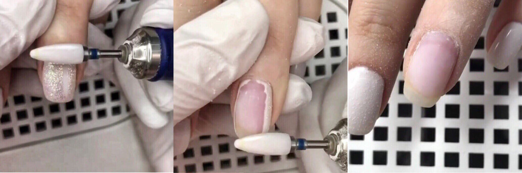 - The second method is mechanical cutting of the coating using a milling cutter. The most convenient way to do this is with the use of a manicure machine. Many masters prefer this method, because among them there is a perception of the least harm of this method. The fact is that the mechanical removal of the gel can damage only the top layer of the nail, while the compress described above is harmful to the deeper layers of the plate.