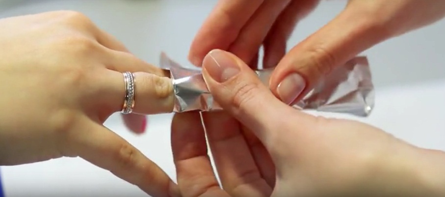 - Wrap the foil over the material soaked in solvent. It should be wound in several layers on the tip of each finger and fix the upper free edge in the form of a cone. The foil should fit snugly to the upper phalanx. Instead of foil, you can use special silicone caps. They are easily and conveniently put on a finger over pieces of cotton pads. The processing time of the shellac layer in this way is 15-20 minutes. That is how much time you need to keep fingers in the foil. Hands should be placed down with your palms. This will ensure the most uniform distribution of the composition of the nail plates.