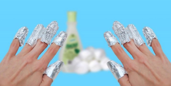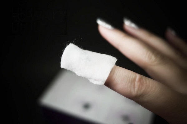 - Cotton pads or pieces of gauze should be moistened abundantly in a special compound or in acetone. Each wetted piece needs to be put on the nail plate so that it covers it completely.