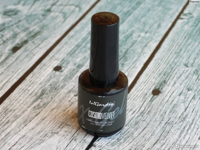 Matte top with a slight bias to the corduroy type. Thick consistency. On the nails with such a coating are not visible scratches, chips are not formed. Antistatic effect repels dust. Persistence of manicure reaches 4 weeks, over time, the coating does not turn yellow and does not darken.