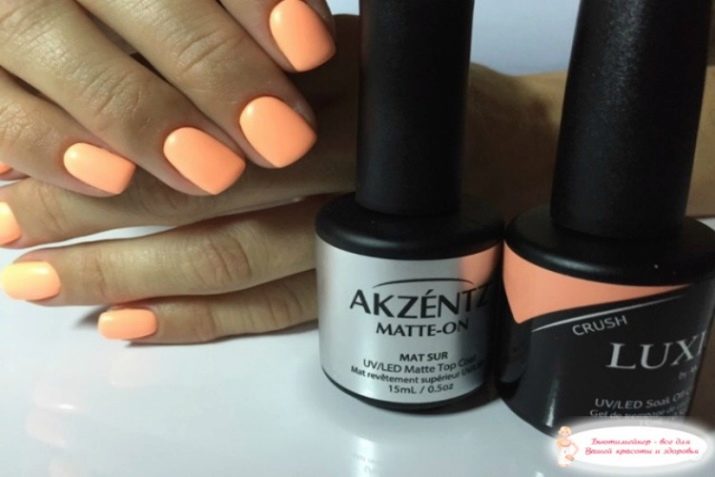 Matte top luxury. Low hypoallergenic coating. The consistency is thick, self-leveling. Matte effect is pronounced, resistant. Quickly polymerizes in the lamp.