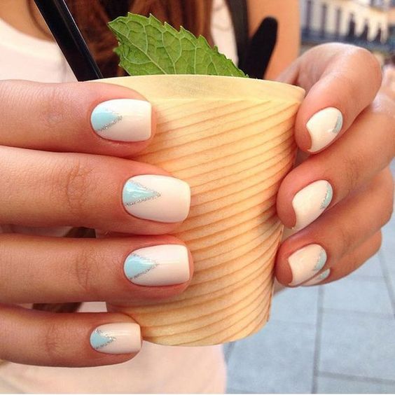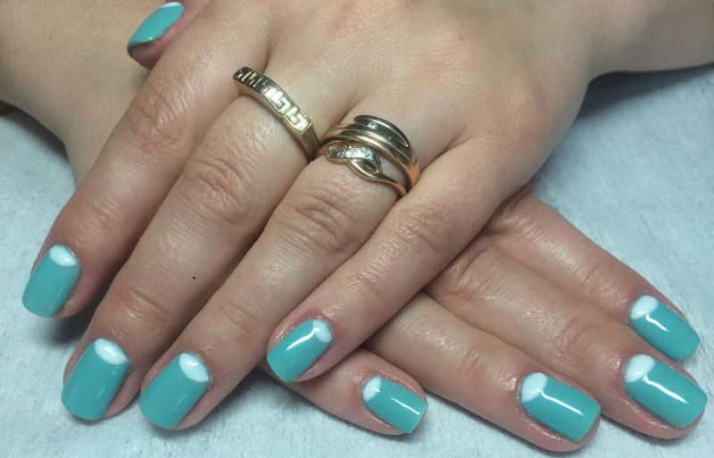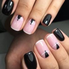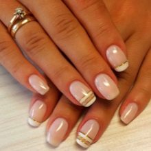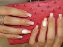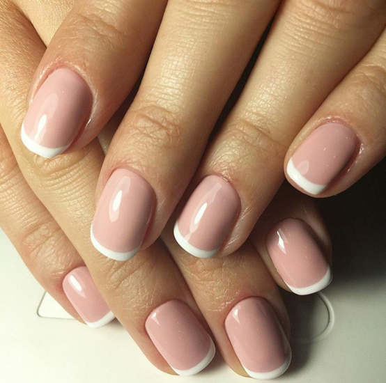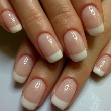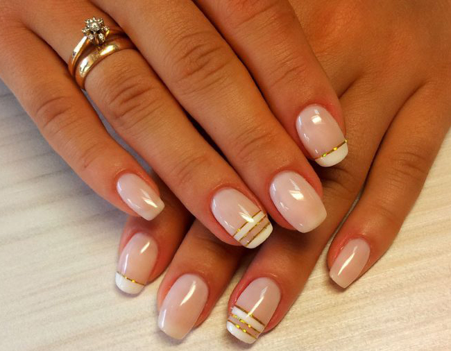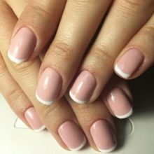 - French manicure. Relevant this season and french. You will need shellac nude shades and white. Initially, the nails are prepared according to the above scheme.After that the base is applied, the selected shade. Each layer is polymerized. Then follows with the help of white color to draw a smile line. You can use various other color options, embodying a fashionable manicure. Now it is important to make a smile line in geometric forms.