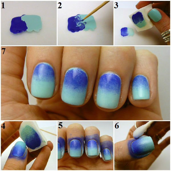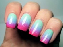 - Ombre. This manicure is a smooth transition from one shade to another. Making it pretty simple. It is enough to choose the color scale of shellac and apply it on the nail plate. Using a fan-shaped brush, gently blend the hues. You can also take a piece of foil and put two drops of shellac on it in different shades. Using a toothpick, mix the tones in the place of their contact. After that, take a sponge, dip it in shellac and transfer everything to the surface of the nail plate. Movement must be clear and confident. Repeat the process several times to get rich colors. After that, the layer is polymerized, and the top layer is applied on top.