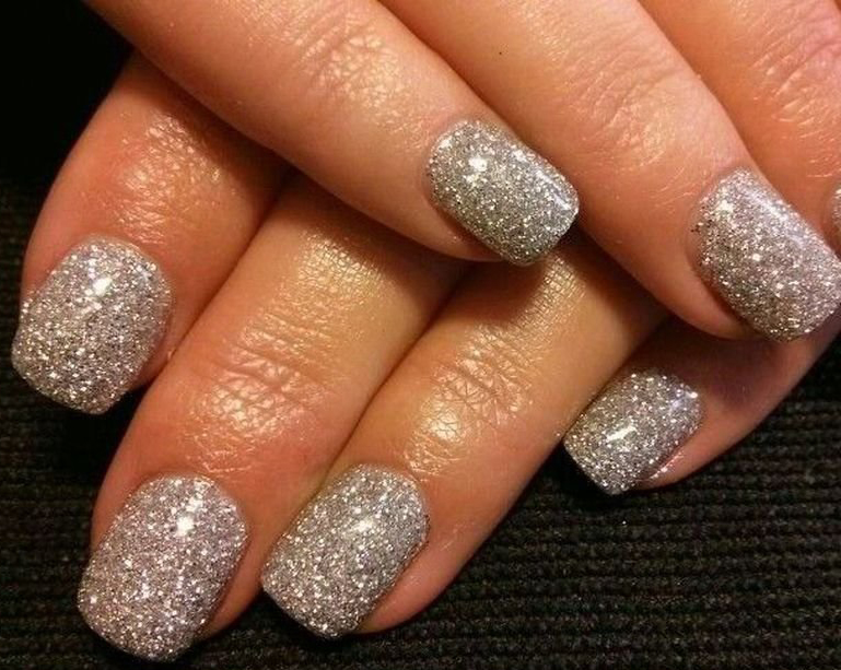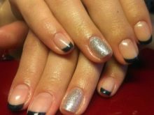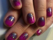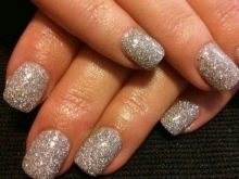 - With sparkles. Successfully and quickly you can decorate your nails with sparkles. They will create a festive atmosphere, emphasize your stylish bow. You can decorate both the entire nail plate, and its part, putting the shining particles along the smile line.