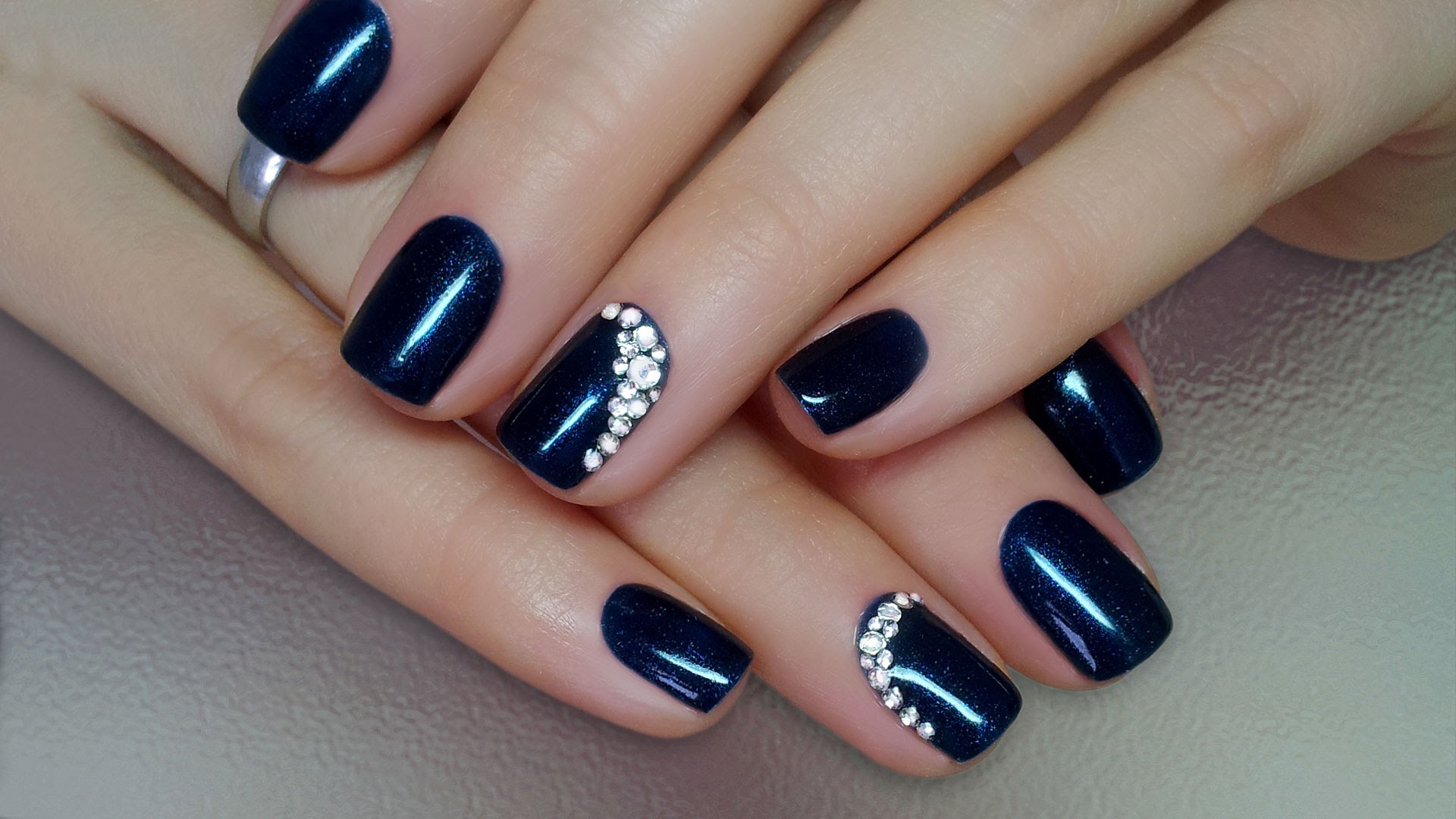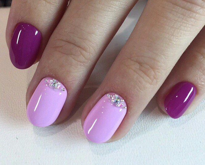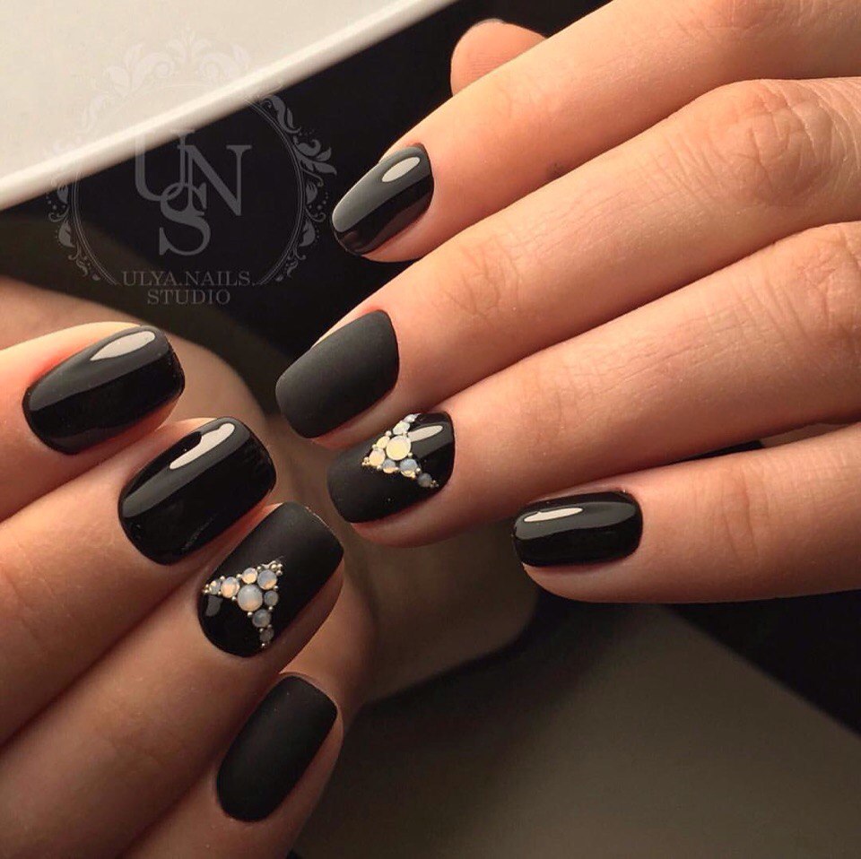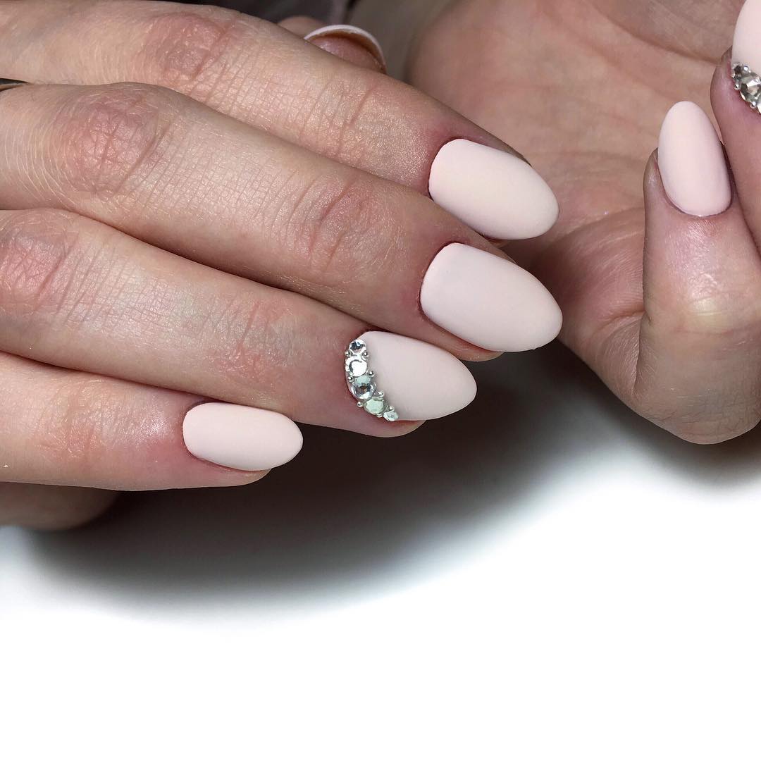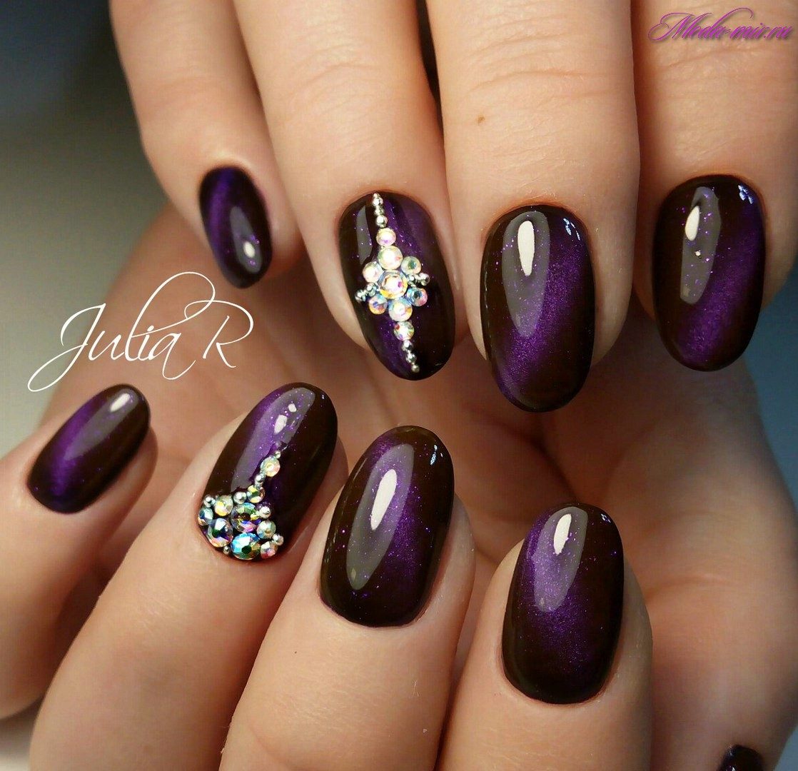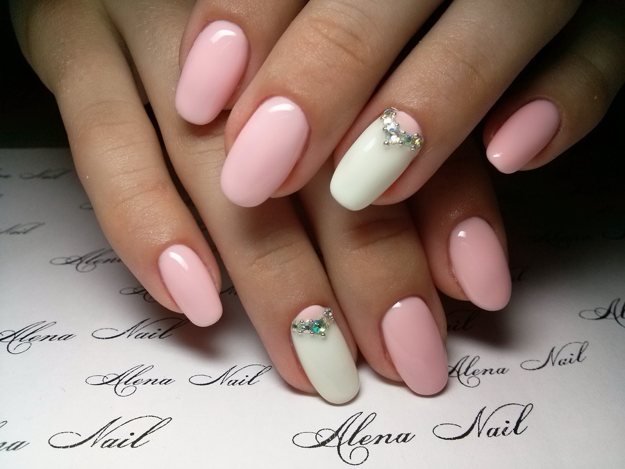 Very popular manicure with rhinestones. Pebbles, rhinestones or beads work well with varnish. Such a design is most often done on one nail, but in some cases they involve several or even all - the idea of decor here depends on the dimensions of the luminous elements, their number and the concept of the original composition.