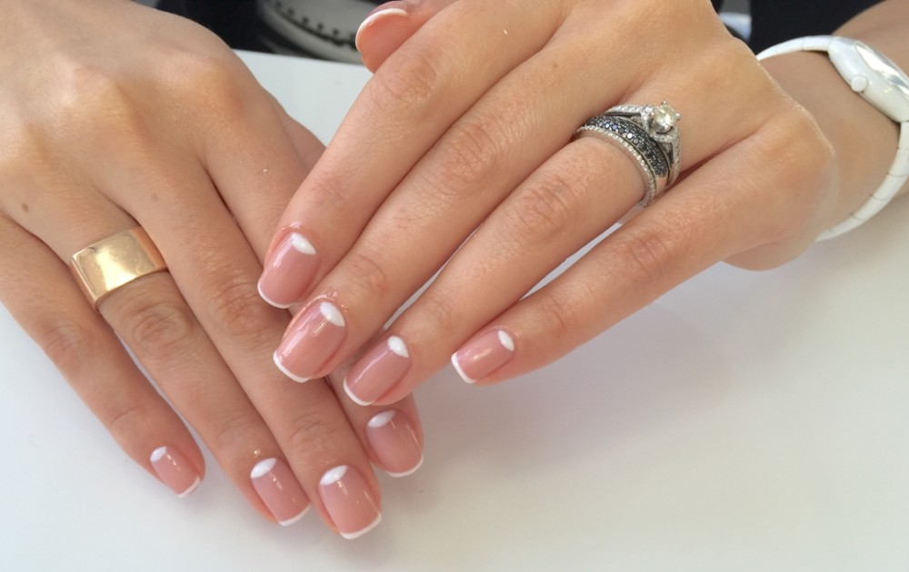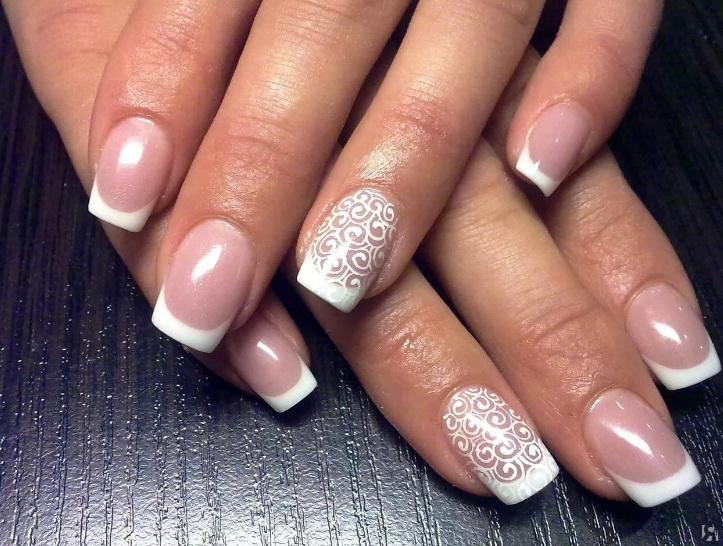 The leader in the list is a jacket, better known as French manicure.in which the nail plate is covered with a light shade, and the smile line (the overgrown part of the nail) is drawn in a different color. In the classic version these are white tones, but fashion does not stand still and today the decor can be made in other shades, but certainly light.