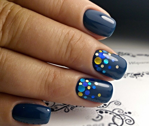 New in the nail industry has become a manicure with kamifubuki. In fact, these are the same sparkles, only rather large ones. Visually, they look like confetti, although they do not have to be round at all. With the help of kamifubuki, shellac manicure, which is incomparable in its originality, creates beautiful beautiful compositions from them, putting them on nails in an interesting sequence, decorating their tips of the nails or decorating only a few fingers.