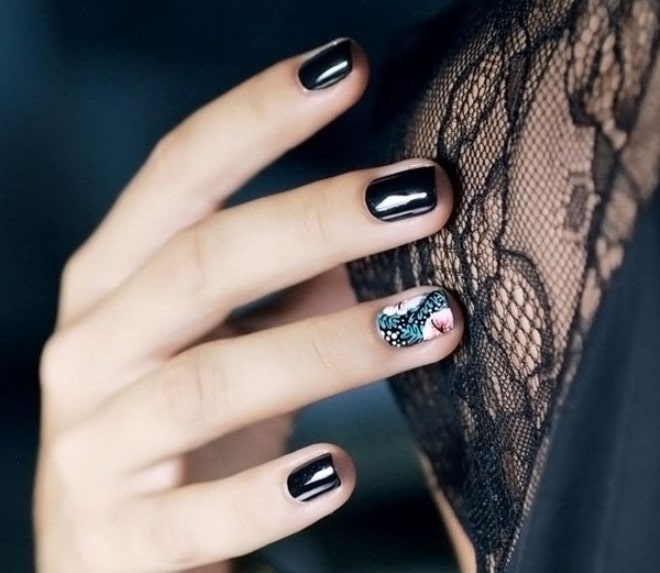 Restrained conciseness is always in fashion and always in place, so a universal cover can be made in a technique in which nails are covered in the same color, usually nude or black, and to give a manicure a light zest, one of the nails is decorated with a pattern or rhinestone. Thanks to this addition, the coverage will be appropriate at special events, but the decor is minimal, so it will not seem superfluous in a strict atmosphere.