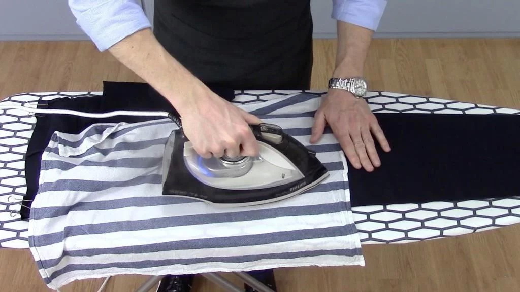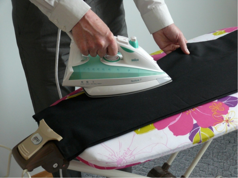 - Next, turn the product on the front side. Pants are pulled onto the board or a special pad is placed under them.The iron will need to be rearranged frequently, as if you were stripping the cloth. Next, the trousers ironed with a turn on the ironing board around the axis, or quickly turn over on the table.