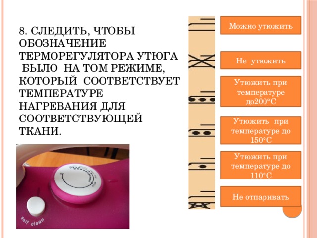 - You should not press the heated iron to the product, otherwise the seams will be printed on the leg. Clothes made of cotton and linen can be safely ironed without a nozzle or gauze.