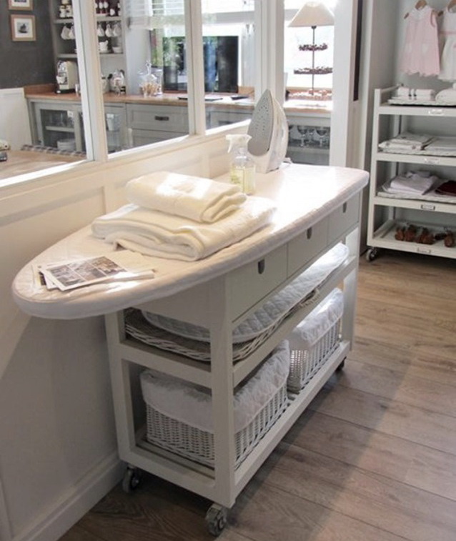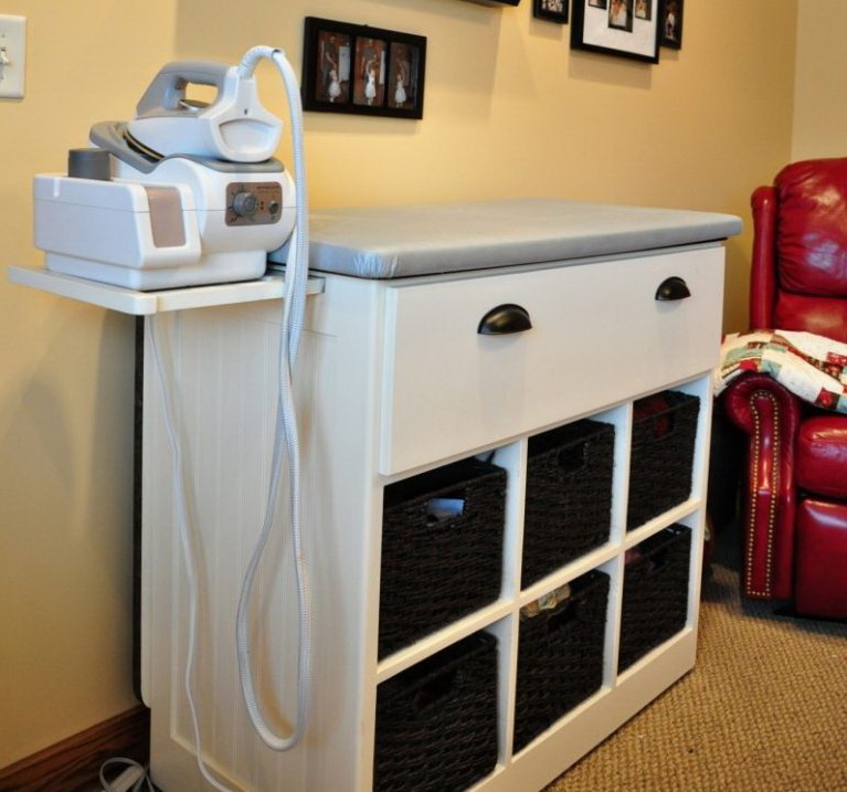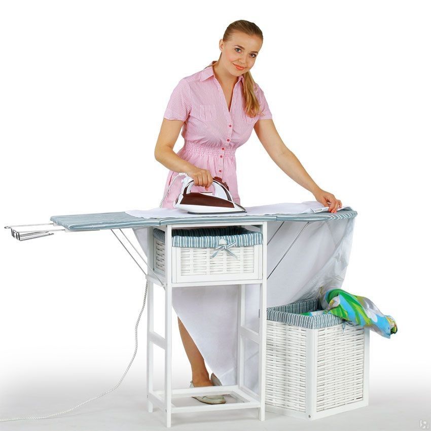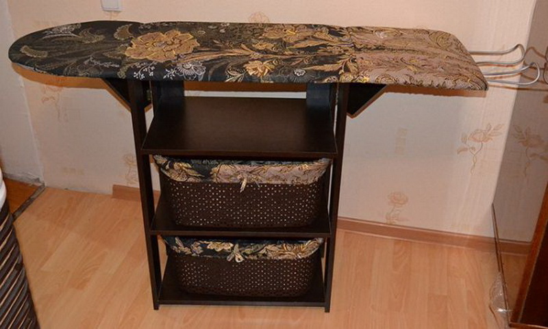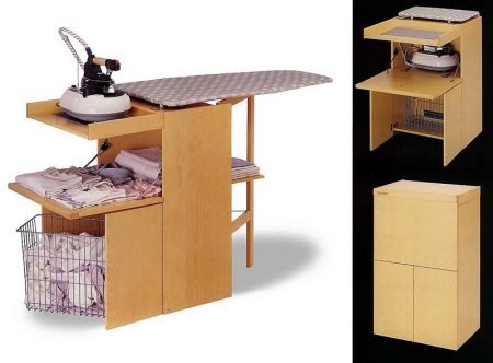 Ironing chest saves space. In addition to the surface for ironing, it is equipped with various shelves, drawers, baskets and other storage items. At once, a lot of things find their permanent place and do not create chaos in the apartment. It is very convenient to have an iron, a sprinkler, a wristband on hand, and then it is easy to hide everything until the next ironing.
