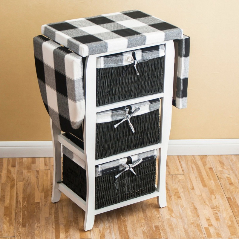 The device frame is not much different from the usual dresser, it consists of the back wall, side surfaces, bottom, top cover. Sometimes the frames are made through, without back walls, and the shelves are filled with baskets. The ironing board can be transformed in different ways: to fold, slide out or just lie on the surface of the dresser. The chest itself has a varied filling system: shelves, drawers, baskets. The basis for the design can be small legs, movable rollers or basement bottom.