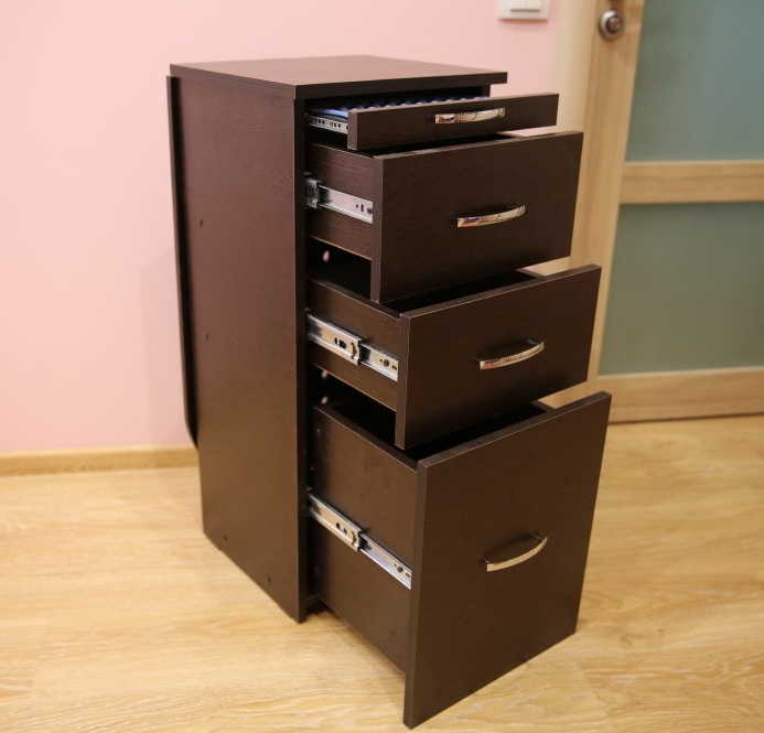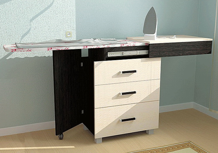 The ironing chest of drawers is a “transformer” that can be transformed from ordinary furniture into a design for ironing. Due to the presence of a special folding mechanism, a similar transformation takes place. There are several ways to fold.