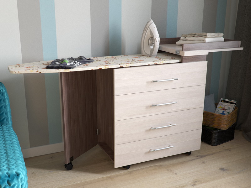 Most often, the industry produces "transformers" that easily mask the board., turning it into a familiar piece of furniture. This design is placed in any room where there is enough space for the transformation and comfortable ironing. Therefore, dressers can meet a variety of purposes: for the hall - elegant or presentable bollards; for the bedroom - complete designs with large drawers for linen.