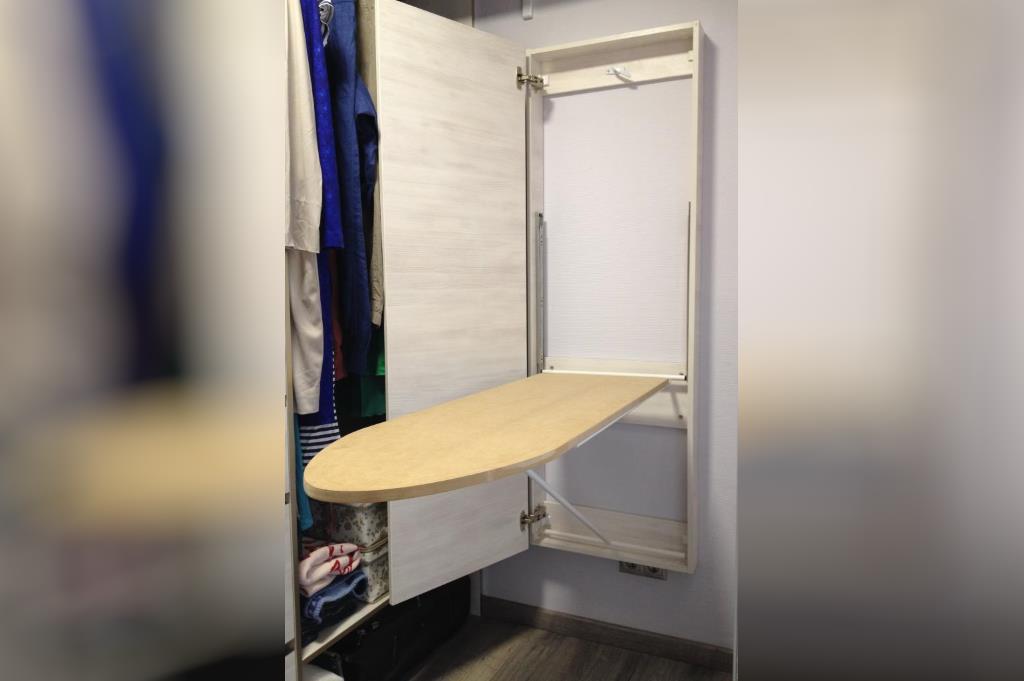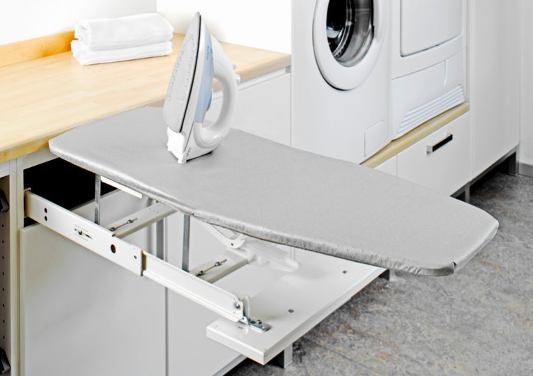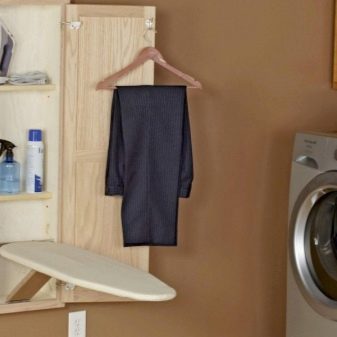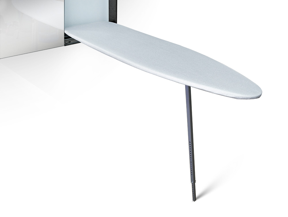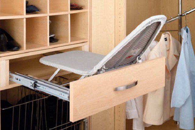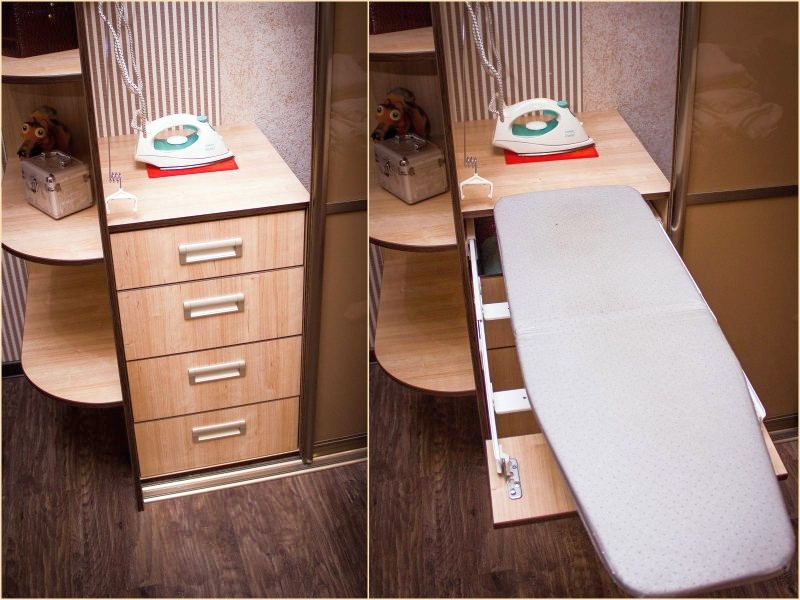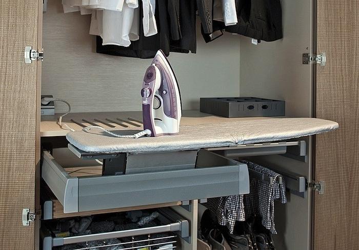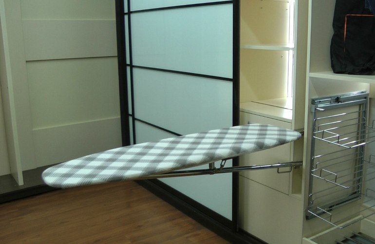 A very convenient option is to embed the ironing surface in a sliding wardrobe or a separate shelf. In this case, an additional lifting mechanism is also mounted, which raises the board higher during operation and lowers it to the level of the shelf, which makes it possible to hide it, making it completely invisible. There are also built-in structures that have the ability to turn to iron any things with maximum comfort.
