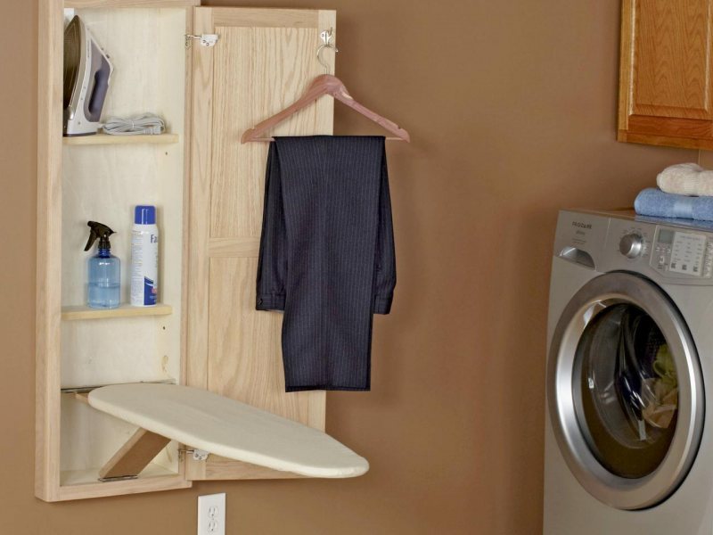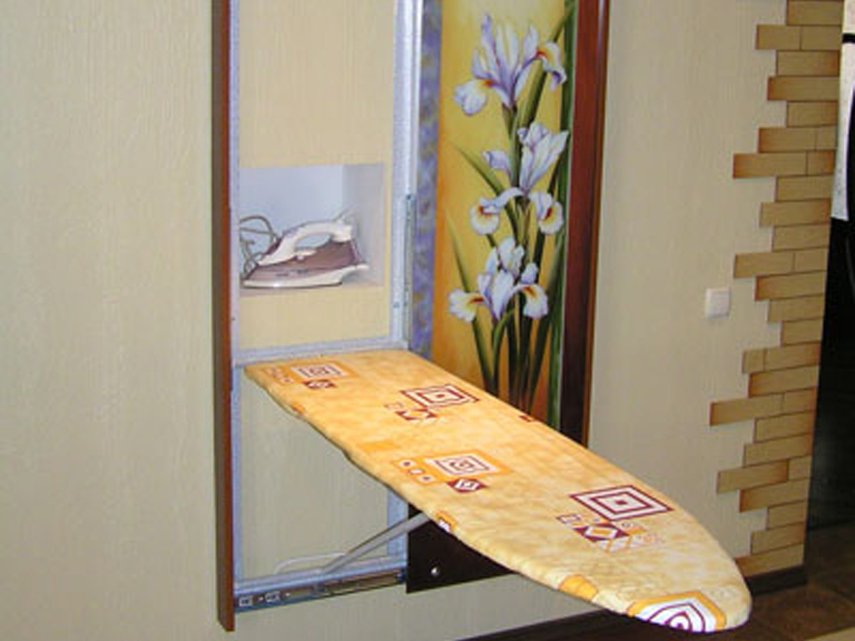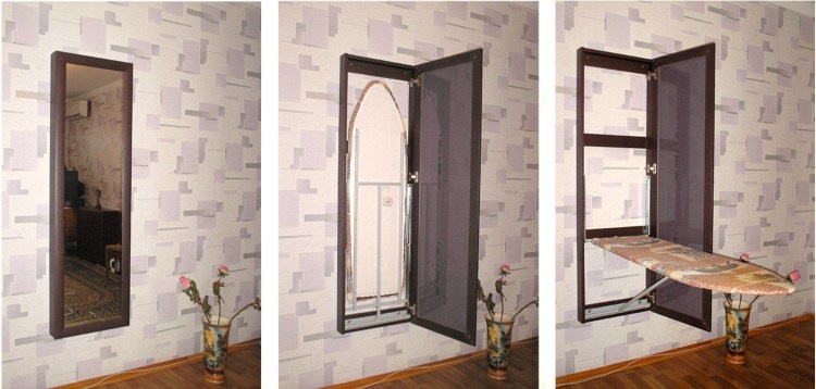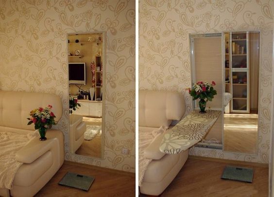 The folding ironing board can be hidden behind the mirror, which will allow solving several problems at once: a convenient place for the board, expansion of the space due to the mirror, the ability to look at oneself in full growth, thanks to the corresponding dimensions of the ironing surface.